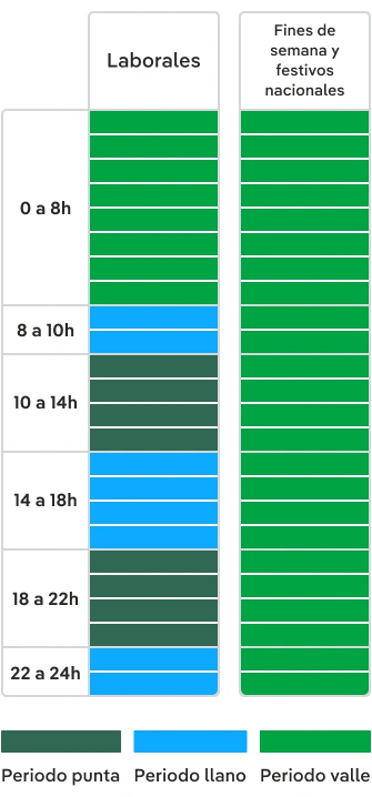 Los periodos horarios vigentes en 2025 para potencias inferiores a 15 kW en la Península, Canarias y Baleares (tarifa 2.0 TD) son: