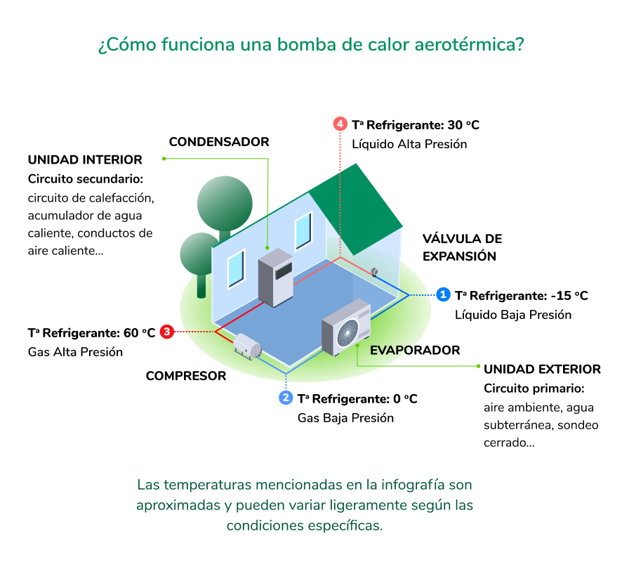 La aerotermia funciona mediante una bomba de calor que extrae energía del aire exterior, incluso en condiciones de frío extremo.