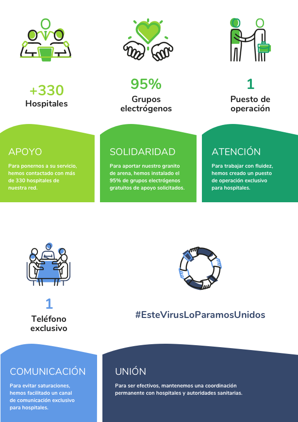 El resumen de esta acción, en números, incluía a más de 330 hospitales, hospitales de campaña y hoteles medicalizados, les facilitamos un teléfono exclusivo de atención 24h y llegamos a instalar más de 50 grupos electrógenos en todos esos centros. Todo esto, sin dejar de prestar nuestros servicios habituales.