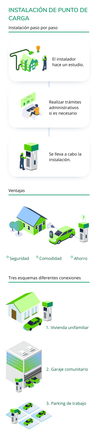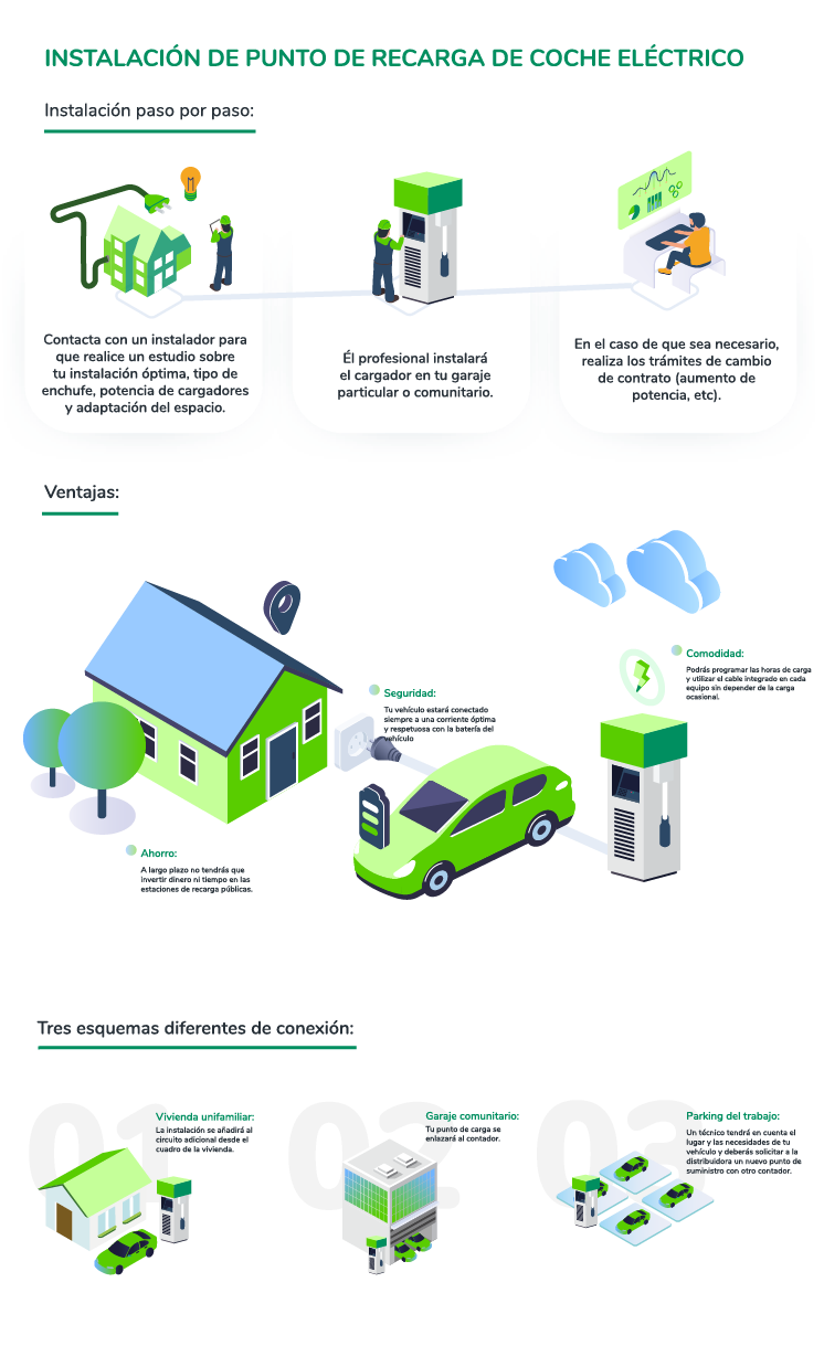 Estas son las tres principales ventajas de tener un cargador en casa: • Seguridad: Te asegurarás de tener siempre enchufado el vehículo a la corriente el tiempo necesario para una carga óptima y protegerás su batería. De este modo, se asegurarán las máximas condiciones de seguridad durante todo el proceso de carga, protegiendo la instalación eléctrica de la vivienda y la del propio vehículo.