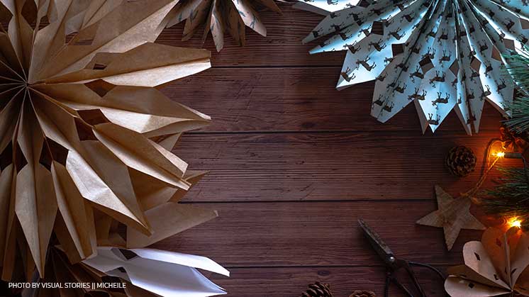 Aprovecha los materiales utilizados para otros adornos sostenibles y decora la mesa donde compartirás cenas y comidas con tus familiares. Las ramas secas pueden servir para crear un móvil navideño que cuelgue por encima de la mesa, también puedes crear porta velas, estrellas navideñas y relleno para tu belén con este material. También puedes optar por colocar bolsas de papel reciclado a las que previamente hayas dado forma de sol, estrella o copo de nieve e introduciendo dentro bombillas led que funcionan con pilas podrás iluminar de forma bonita tu mesa.